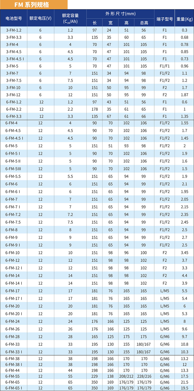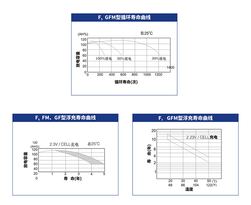 FM、GF型充電電壓在2.25-2.30V/單體,溫度在15- 25°C時(shí),壽命達8- 10年見(jiàn)F6,GFM型充電電壓2.23-2.25V/單體,溫度在15-25°C時(shí),壽命達15年見(jiàn)F7。